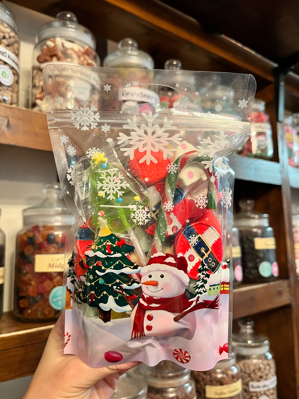 A handheld Christmas bouquet with a selection of chocolate and festive sweets.